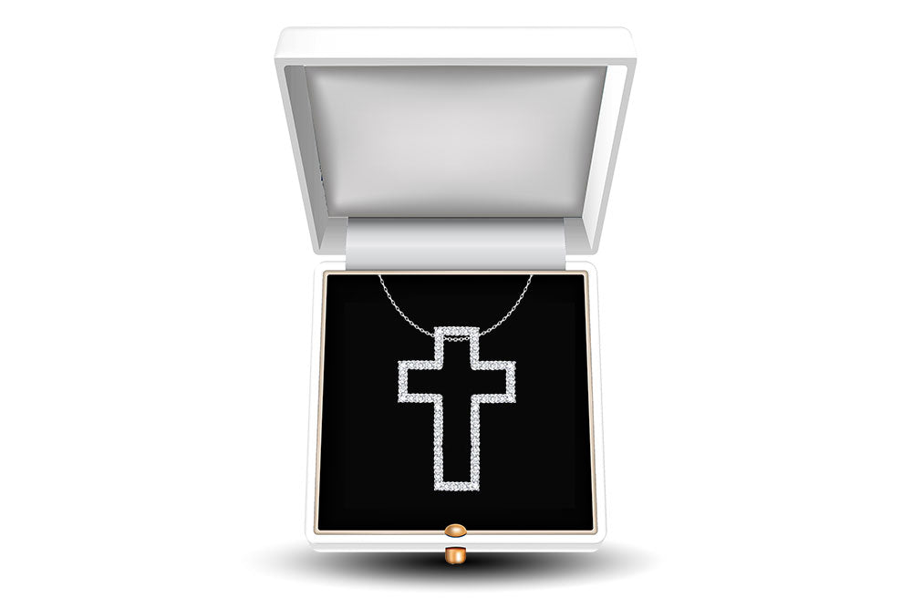 Encrusted with shimmering round brilliant cut diamonds that radiate brilliance and sophistication. Each diamond is carefully selected for its exceptional clarity and sparkle, ensuring that this necklace truly stands out from the rest. The cross is delicately crafted from high-quality precious metals of your choice adding a touch of opulence to the design.